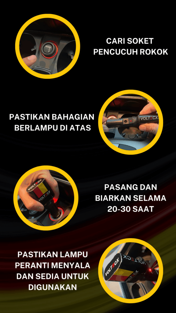Pastikan kenderaan anda ada soket api rokok. Cucuk pada soket tersebut dan pastikan lampu pada Voltecx menyala untuk pastikan ianya berfungsi. Tunggu 30-60 saat dan anda boleh mulakan perjalanan.